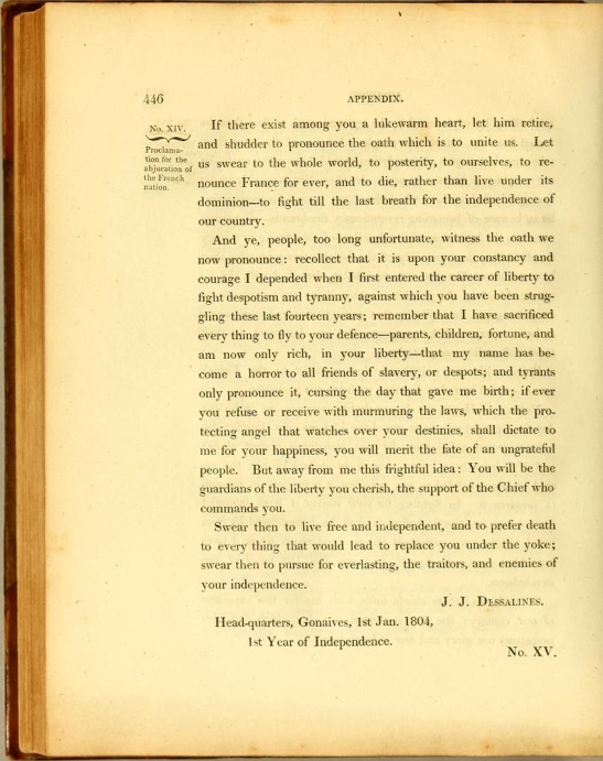 Below are images of the Haitian Declaration of Independence from Marcus Rainsford’s 1805 An Historical Account of the Black Empire of Hayti from the collection at the John Carter Brown Library. Paul Youngquist and Gregory Pierrot have recently published an edited version of Rainsford’s book.