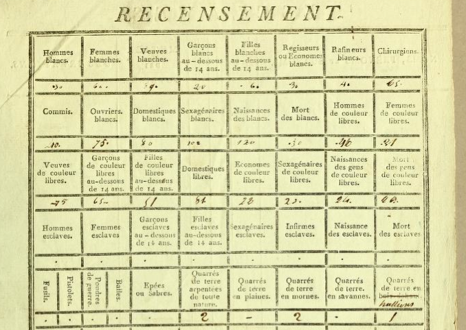 There are a number of really interesting features in the document, including the fact that it is a form that was ten years out of date; slavery had been abolished in 1793 but the form has a number of categories for “esclaves,” (the entries for “esclaves” are left blank except for the total population of “Nègres” at the bottom of the reverse).