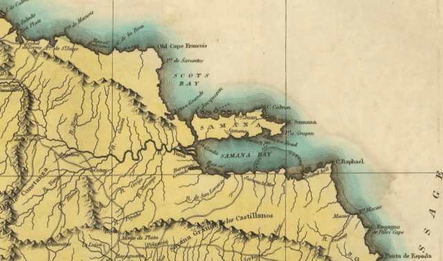 Samaná is a little piece of earth advancing into the Atlantic Ocean on the Northeastern coast of Hispaniola. It is what the French call a presqu’île, almost an island; so close to being an island, in fact, that Europeans visiting the area –starting with Christopher Columbus–have tended to mistake Samaná for one. Although Juan Lopez corrected the mistake on his 1784 map of the island, Samaná was routinely portrayed as an island into the nineteenth century. Misleading appearances for a territory that enters Western history for a moment of misunderstanding, leading, inevitably, to violence: it was in Samaná Bay that Columbus and his crew, repairing on their way back from their first transatlantic voyage, met a group of natives displaying what the Spaniards judged to be hostile behavior. Feeling threatened, the Europeans attacked, making Samaná the location of the first violent encounter between Europeans and native Americans in the Caribbean.