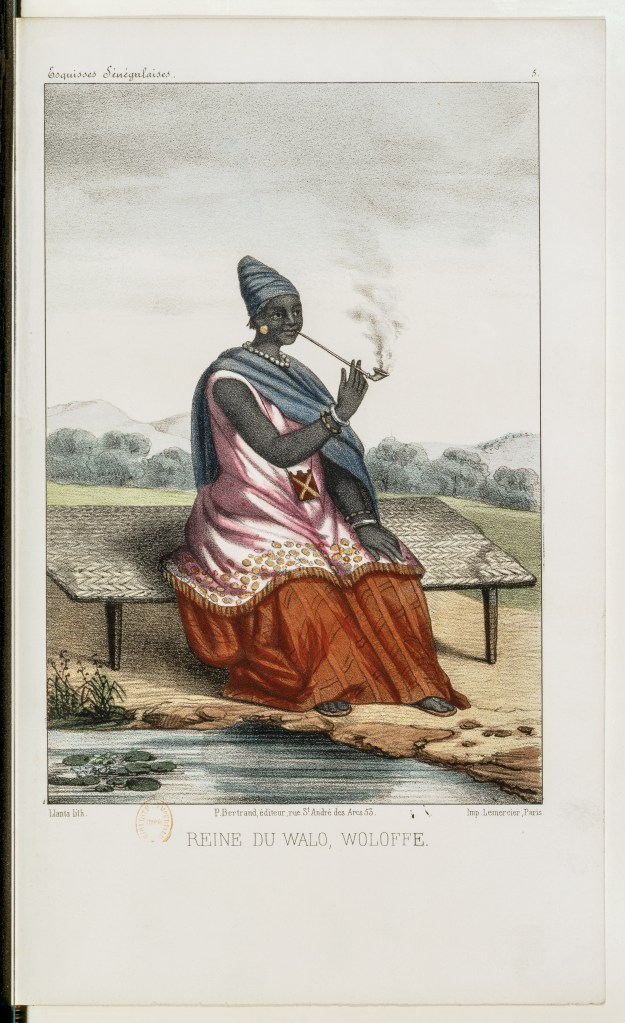 4-LK11-97 (2) – pl 5 – NdetÈ-Yalla, reine du Walo en tenue royale (1853) Published August 18, 2020 at 3918 × 6416 in Secondary Sources and Document Packages Ndeté-Yalla, lingeer of Waalo, in Abbé David Boilat. Boilat, Esquisses sénégalaises: Physionomie du pays, peuplades, commerce, religions, passé et avenir, récits et légendes (Paris: P. Bertrand, 1853), plate 5. Bibliothèque national de France. Like Loading...